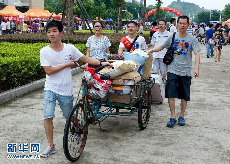 9月4日,福州大學迎新現場,學長推著三輪車為新生運送行李。當日,福州大學迎來7000多名新生入學,各院系的迎新學長們各司其職,想方設法為學弟學妹們提供幫助,營造溫馨入學環(huán)境。 新華社記者姜克紅攝