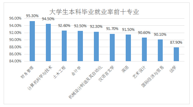 據(jù)2016年6月12日,麥克思研究院發(fā)布的《2016年中國大學(xué)生就業(yè)報告》,指出大學(xué)畢業(yè)生就業(yè)重心發(fā)生變化,民企、中小微企業(yè)、地級市及以下地區(qū)等成為主要就業(yè)去向。大學(xué)畢業(yè)生在民營企業(yè)就業(yè)的比例從2013屆的54%上升到2015屆的59%,與此同時,在國有企業(yè)就業(yè)的比例從2013屆的22%下降到2015屆的18%,在中外合資、外資、獨資企業(yè)就業(yè)的比例從2013屆的11%下降到2015屆的9%。并且列出2015年大學(xué)畢業(yè)生就業(yè)率較高的前十大專業(yè):