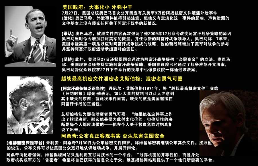秘密文件曝光引發(fā)媒體一片嘩然。美國和巴基斯坦政府則對文件公布表示強烈不滿。“美國政府強烈譴責個人和組織泄露機密信息的做法,這樣做會把美國人和我們合作伙伴的性命置于危險境地,威脅我們的國家安全!泵绹偨y(tǒng)國家安全事務(wù)助理詹姆斯·瓊斯發(fā)表聲明說。他同時堅稱美國和巴基斯坦的合作以及阿富汗戰(zhàn)事不會受到影響。 【詳細】 行動:美軍方擴大阿富汗戰(zhàn)爭秘密文件外泄調(diào)查范圍
