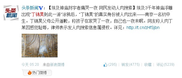 當我們回過頭來再思考一下整個事件,對于丁錦昊而言,無疑他犯了錯誤,他讓有3500年歷史的盧克索神廟在哭泣了,在丁錦昊與它那場跨越千年的對話中它蒙羞了,它已走過了三千多年的漫長歲月,在公元2013年卻被刻上了永不可抹去的傷痕。但之后網(wǎng)友的人肉搜索和口誅筆伐對于一個13歲的孩子是否過于殘忍了?