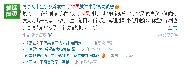 在5月24日丁錦昊“到此一游”事件曝光后,輿論引起軒然大波。至5月25日晚11點,評論已達11000多條,轉(zhuǎn)發(fā)達到83000多條,網(wǎng)上的相關(guān)評論則達數(shù)十萬條,而主題詞就是中國游客的“素質(zhì)”。在譴責這種不文明行為的同時,也有網(wǎng)友“人肉”出,丁錦昊是南京某中學在讀的初一學生等個人信息。而網(wǎng)友對于丁錦輝的聲討更是一浪高過一浪。 5月25日,丁錦昊的父母主動站出來發(fā)聲,在為孩子的行為道歉的同時,也懇請得到改正的機會,并透露,題字風波發(fā)酵后,孩子哭了一整夜。至此,丁錦昊“到此一游”事件算是暫時告一段亂。