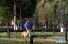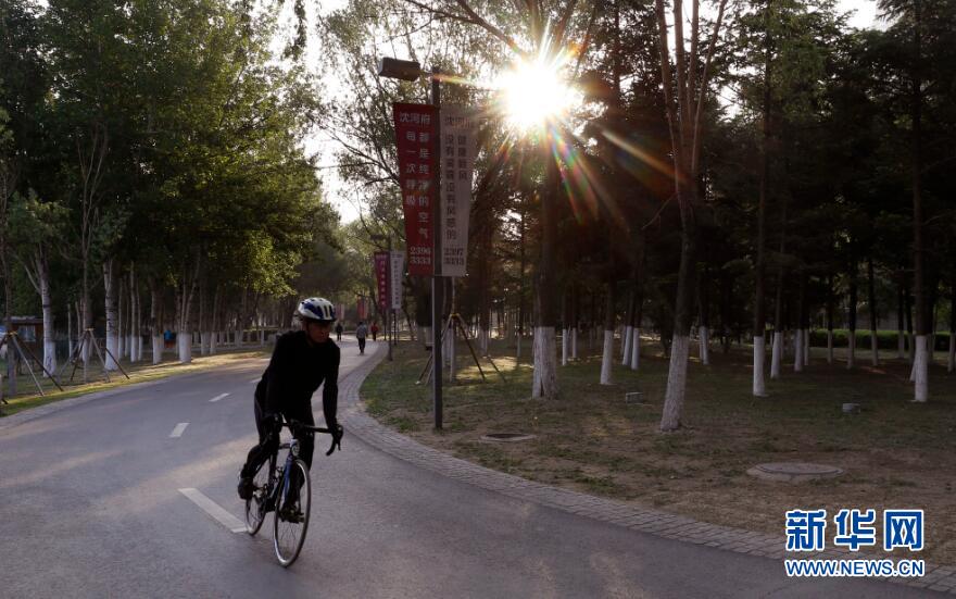 初夏的沈陽市陽光和煦 ,氣候宜人,位于沈陽市渾河畔的奧林匹克公園風景如畫,每天都吸引大量市民前來賞景、晨練、垂釣,這里已成為城市中一道靚麗的風景線。圖為一位市民清晨在公園內(nèi)騎行。新華網(wǎng) 姜冰攝 -
