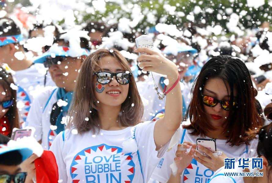 圖為帥哥美女在泡泡中忙著自拍。新華網(wǎng) 姜冰攝 -