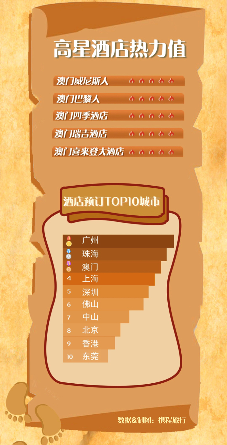 寶藏之城蘊(yùn)藏密碼,找到澳門的寶藏酒店就是第一步。攜程數(shù)據(jù)顯示:澳門威尼斯人、澳門巴黎人、澳門四季酒店、澳門瑞吉酒店、澳門喜來(lái)登大酒店是用戶預(yù)訂熱門酒店。廣州、珠海、澳門、上海、深圳、佛山、中山、北京、香港、東莞等城市的游客是澳門酒店預(yù)訂的主力軍。