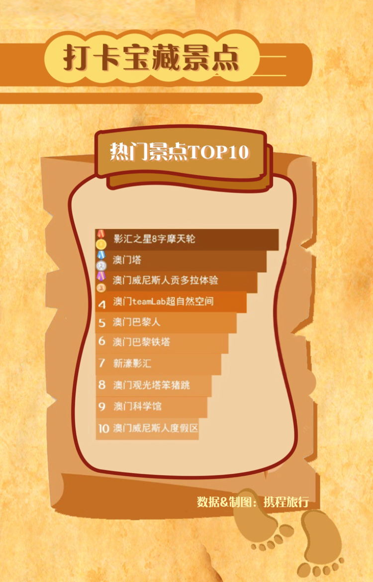 澳門超級(jí)多的美景游客也不應(yīng)錯(cuò)過。從數(shù)據(jù)中可看出:影匯之星8字摩天輪、澳門塔、澳門威尼斯人貢多拉體驗(yàn)、澳門teamLab超自然空間、澳門巴黎人、澳門巴黎鐵塔、新濠影匯、澳門觀光塔笨豬跳(蹦極跳)、澳門科學(xué)館、澳門威尼斯人度假區(qū)是游客喜愛的Top10熱門景區(qū)。