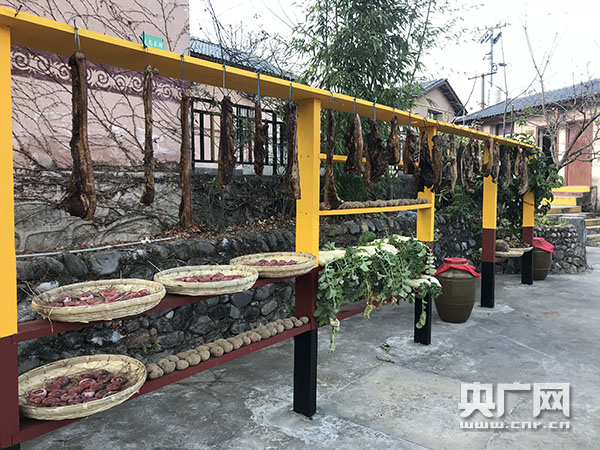 板橋村阿明彝家樂(農(nóng)家樂)小院里晾曬的臘肉的食物。