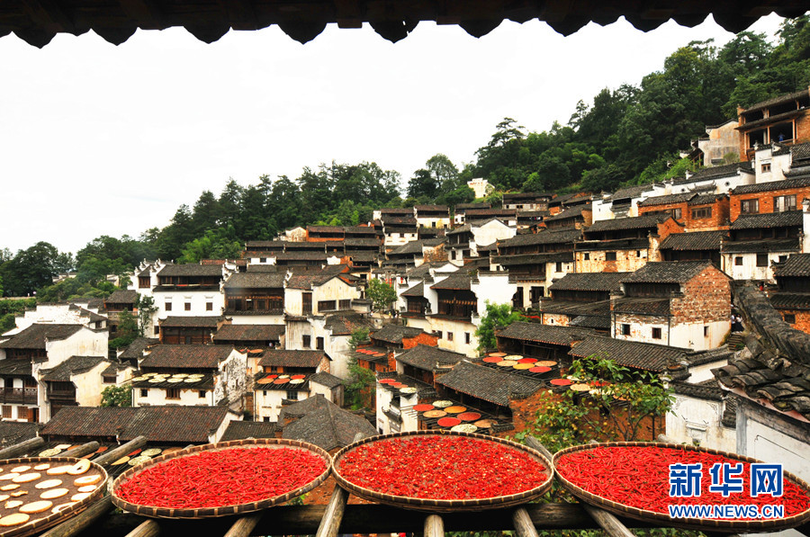 7月9日,第二屆中國(篁嶺)曬秋文化節(jié)在婺源啟幕,農(nóng)歷六月六是中國傳統(tǒng)的洗曬節(jié),篁嶺“六月六,家家曬紅綠”,當?shù)氐睦习傩辗涞构,拿出衣物、鞋帽、被褥晾曬,也把切好的辣椒、青菜拿出來晾曬,因這時天氣已非常悶熱,再加上雨季,氣候潮濕,萬物極易霉腐,篁嶺的老百姓也在這一天把廚房用具和舊衣物拿出來洗刷晾曬,以求吉利。掛在山崖上的篁嶺古村,地無三尺平,數(shù)百棟徽派古民居在百米落差的坡面錯落有序,每當日出山頭,晨曦映照,整個山間村落飽經(jīng)滄桑的徽式民居土磚外墻與曬架上、圓圓曬匾里五彩繽紛豐收果實組合,從而在無意間造就了一處中國絕無僅有的“曬秋人家”風情畫。