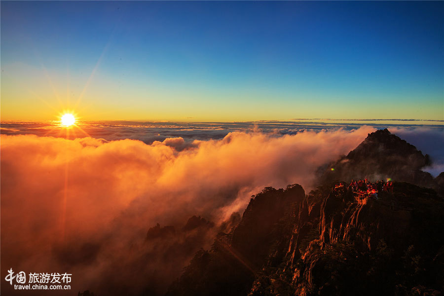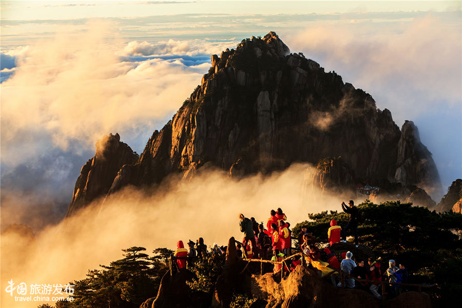 中國網(wǎng)9月17日訊 9月17日,成百上千名游眾在黃山風景區(qū)光明頂觀賞云海、日出和彩虹美景。當天早上,在朝霞的映照下,云海中的白色云團、云層和云浪都染上絢麗的色彩,像錦緞、像花海、像流脂,與奇松、怪石和秋色相映成輝,眼前的黃山猶如國畫大師李可染筆下的《黃山煙霞》圖。