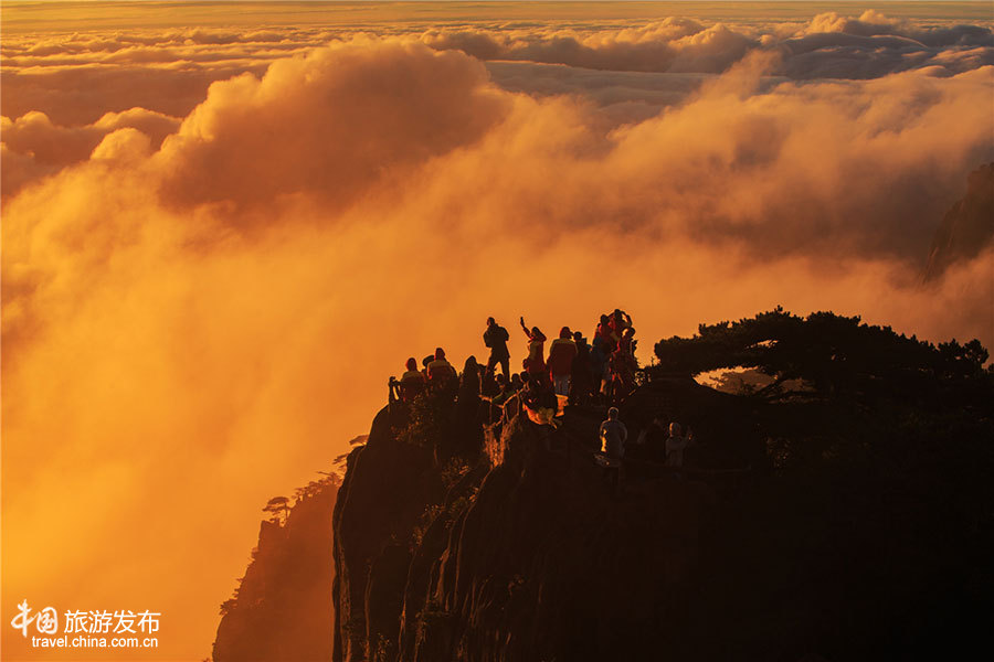 “自古黃山云成海”,廣義上的黃山云海,豐富多彩;論形式,有“云!、“云河”、“云溪”、“云山”、“云瀑布”之分;論規(guī)模,大者如海洋,中者像湖泊,小者似水潭。倘若云海漫上天(云體底部高過人的頭頂),晨昏時刻呈橙紅等色彩,就被稱作“云霞”。(葉永清)