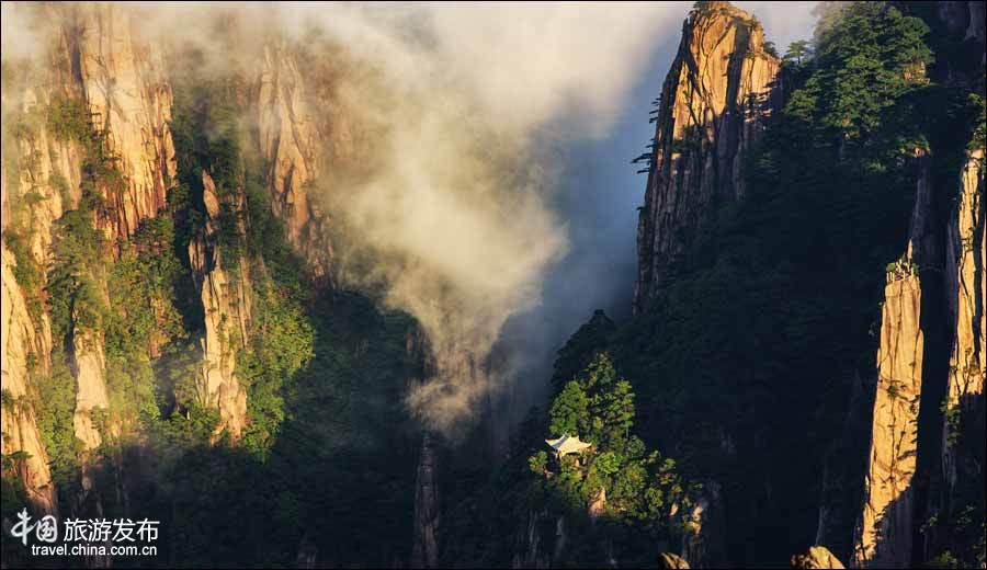 “莫蘭蒂”臺(tái)風(fēng)之后,黃山西海大峽谷風(fēng)起云涌,云霧忽兒滾滾滔滔,忽兒虛無縹緲,忽兒薄紗遮蒙,忽兒氣朗風(fēng)清,薄幕流云籠罩秀美的峰、石、松若隱若現(xiàn)。步入谷中,其險(xiǎn)奇、峻秀集于一身,詩詞歌賦難以言表。