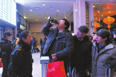 北京站進(jìn)站安檢大廳內(nèi),安檢員要求持液體進(jìn)站的旅客開(kāi)蓋試喝。
