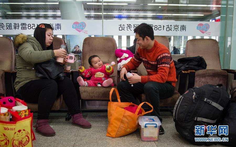 8個(gè)月大的柳瑞穎(中)在經(jīng)歷她出生以來的第一個(gè)春運(yùn)——從南京乘火車到陜西榆林。圖為爸爸柳炳(右)、媽媽王翠在“雷鋒服務(wù)站”照顧她(2月7日攝)。
