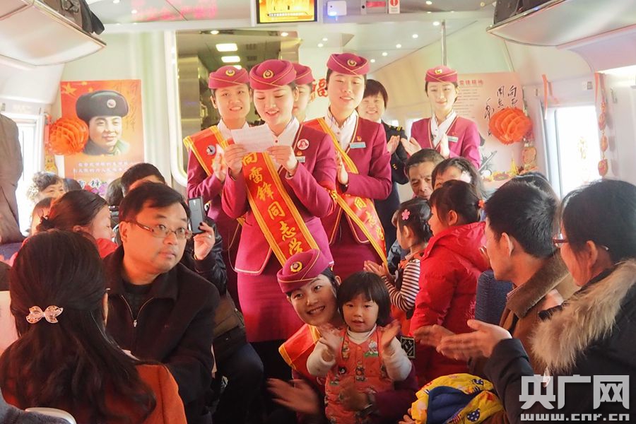 2015年3月5日北京鐵路局在G13次北京南—上海虹橋的旅客列車上開展《弘揚(yáng)雷鋒精神 共建文明家園》主題活動(dòng)。圖為:乘務(wù)員與旅客同唱雷鋒歌曲。(央廣網(wǎng)記者何微攝)