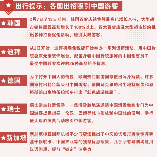 各國(guó)出招吸引中國(guó)游客,韓國(guó)推出多種打折促銷活動(dòng),迪拜機(jī)場(chǎng)免稅店開始舉辦一系列促銷活動(dòng),倫敦、巴黎等城市舉行盛大巡游慶典活動(dòng)吸引中國(guó)游客。