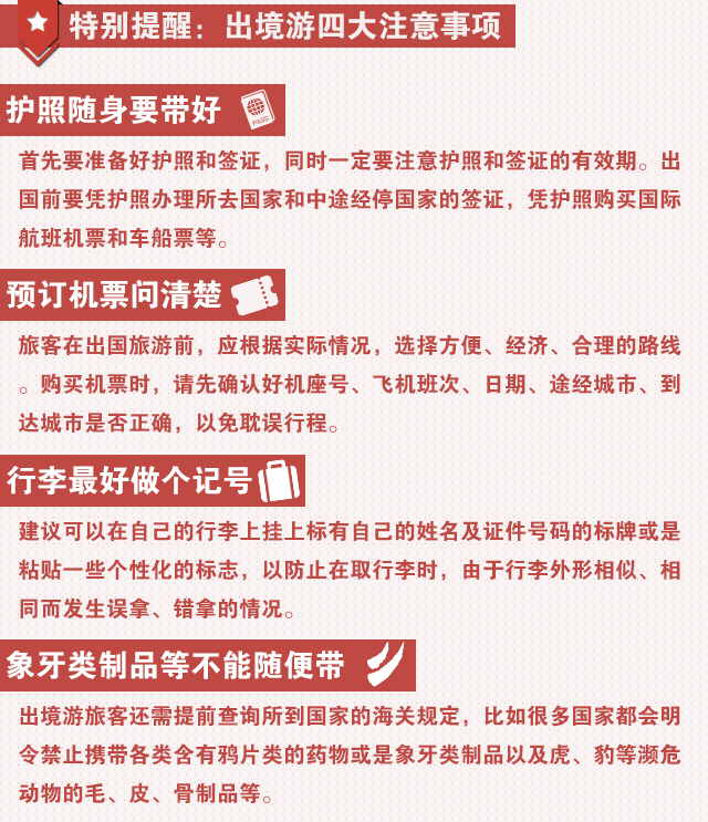 出境游四大注意事項(xiàng):護(hù)照隨身要帶好、預(yù)訂機(jī)票問清楚、行李最好做個(gè)記號(hào)、象牙類制品等不能隨便帶。