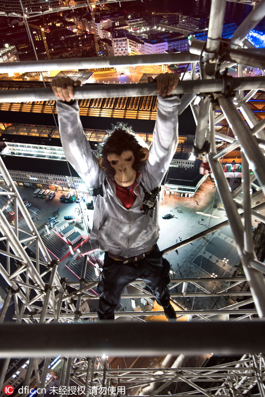 2016年4月21日?qǐng)?bào)道(具體拍攝時(shí)間不詳),德國(guó)科隆,這些令人心跳加速的照片顯示,一名男子懸蕩在科隆一座大教堂的邊緣。同樣膽大的攝影師Flavius Vesely為他的面具朋友Flavius拍攝下了這些驚險(xiǎn)的照片。其中一張顯示Flavius戴著猴子面具懸掛在環(huán)繞教堂的腳手架上,看上去令人心驚肉跳。Flavius來(lái)自德國(guó)卡塞爾,是“視覺(jué)仇敵'組織的一名成員(Visual Enemies),該組織是一個(gè)城市團(tuán)體,由攀爬者和攝影師組成。Flavius Vesely/東方IC