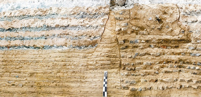 仔細觀察可以看到,夯土堆積層為一層夯土層一層鋪磚層,層層疊壓。夯土為深褐色黏土,大致平面分布,較致密,每層厚度不等。而素土夯土層,開口距地表1米,最深處距地表3米,為黃色綿沙土、褐色黏土和黃色細沙土,層層夯筑,大體呈平面或波狀分布,有的夯層包含少量堅硬的料礓石塊?脊殴さ貓(zhí)行領隊徐華鋒介紹:“從層位關系判斷,夯土鋪磚層建筑基槽、素土夯筑層為該遺址最早的一組堆積。夯土鋪磚層堆積的土質(zhì)土色、包含物、建筑工藝等與慈寧宮花園東院遺址的夯土夯磚層明顯一致,可早到明代早期;而素土夯筑層出土的布紋瓦、琉璃瓦、黑釉、白釉瓷片等遺物具有明顯的金元時代風格。按照考古發(fā)掘‘就晚不就早’的原則,根據(jù)地層關系和包含物可以初步推斷夯土鋪磚層建筑基槽和素土夯筑層的年代為元代!
