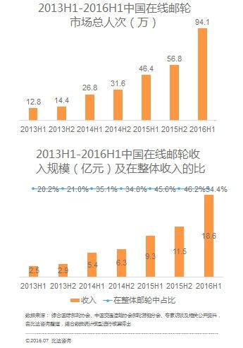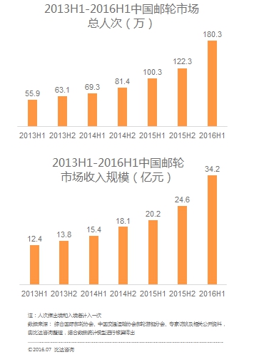 數據顯示,2016上半年中國在線郵輪市場總出游人次達94.1萬,同比增長102.8%,總收入(交易額)18.6億元,同比增長100%,占整個郵輪市場的54.4%,比去年同期提高了8個百分點。