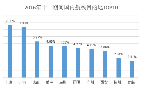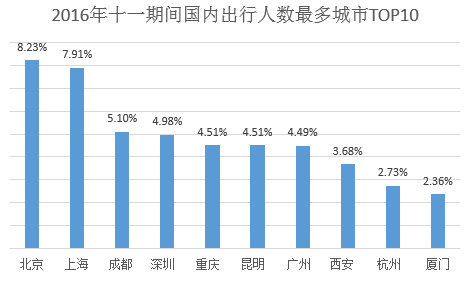 十一期間,哪兒的人出行指數(shù)最高?作為首都的北京當(dāng)仁不讓,上海緊隨其后。北、上、廣、深這四個超一線城市的出游人數(shù)均位列前十名。喜歡安逸的成都人同樣也是十一出游的愛好者,以5.1%的占比排名第三位。專家分析,隨著二線城市居民GDP的提升,收入的增加、機票價格的下降,越來越多二線城市加入到乘機出游的大軍里來。