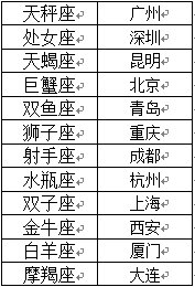 國內(nèi)城市中哪些是十二星座的最愛?據(jù)統(tǒng)計,飲食文化源遠流長的廣州是天秤座的最愛,距離香港、澳門很近的深圳成了處女寶寶的選擇,四季如春的昆明是天蝎座的度假勝地,喜歡全家一起出行的巨蟹寶寶更偏愛老少咸宜的首都北京,愛浪漫的雙魚座則是更多地選擇了既有異域風(fēng)格又能吹海風(fēng)的雙魚座。