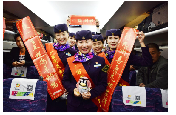 16日早晨9點(diǎn)20分左右,前往貴陽(yáng)北的乘客陸續(xù)排隊(duì)檢票上車,記者看到,“同程返鄉(xiāng)號(hào)“愛心專列的車廂內(nèi)被裝扮得煥然一新,貼心的為老鄉(xiāng)們制造了濃濃的春節(jié)氛圍。