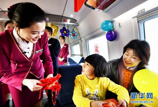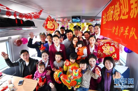 北京鐵路局天津客運(yùn)段津京滬車隊(duì)大學(xué)生乘務(wù)組在北京開往紹興的G19 次列車上,開展了“金雞報(bào)曉迎新年高鐵送福伴回家”主題活動(dòng),乘務(wù)組通過自編自演文藝節(jié)目、普及春運(yùn)旅行常識(shí)和為旅客送福字等方式,為旅客們營造“平安春運(yùn)、有序春運(yùn)、溫馨春運(yùn)”的和諧氛圍。