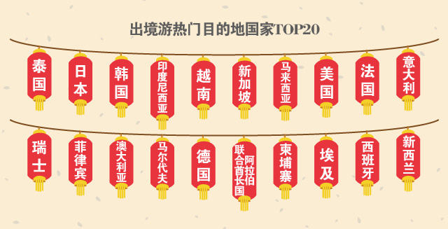 春節(jié)出國游客都去哪兒了?2017年春節(jié),排名前20位的出境游目的地國家依次為泰國、日本、韓國、印度尼西亞、越南、新加坡、馬來西亞、美國、法國、意大利、瑞士、菲律賓、澳大利亞、馬爾代夫、德國、阿拉伯聯(lián)合酋長國、柬埔寨、埃及、西班牙、新西蘭。