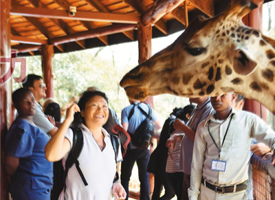 春節(jié)期間,前往非洲旅游的中國游客越來越多。圖為在肯尼亞首都內(nèi)羅畢的長頸鹿中心,一名中國游客和長頸鹿互動。