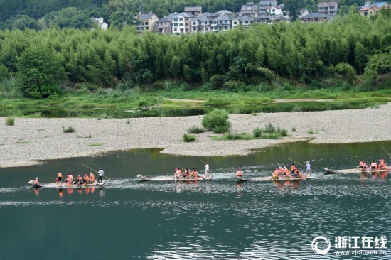 9月3日是雙休日,在桐廬天目溪漂流景區(qū),許多游客乘竹筏漂流,放松心情,享受清涼。(記者 吳元峰 攝)