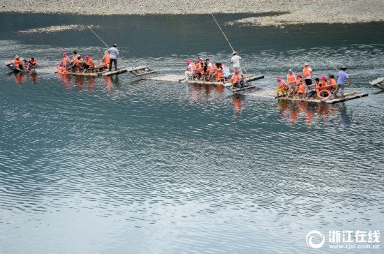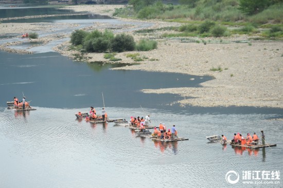 桐廬:游客乘竹筏享受清涼,9月3日是雙休日,在桐廬天目溪漂流景區(qū),許多游客乘竹筏漂流,放松心情,享受清涼。(記者 吳元峰 攝)