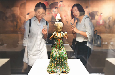 杭州舉行“一日看盡長安花——唐都長安三彩精華展”。圖為觀眾在欣賞“三彩釉陶梳妝女坐俑”。