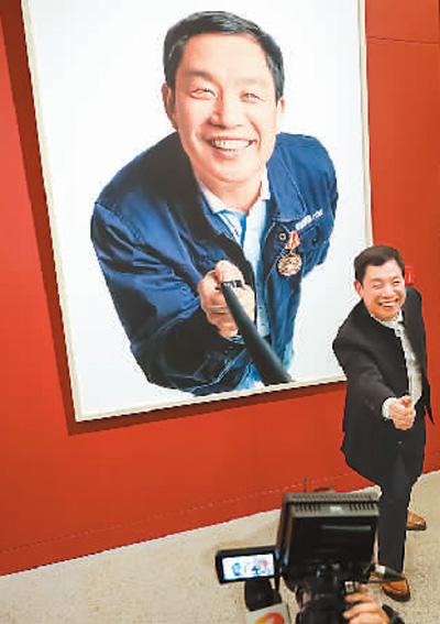 中國國家博物館舉行“擼起袖子加油干——‘中國夢,勞動美’”影像展。圖為謝子龍在自己肖像作品前。