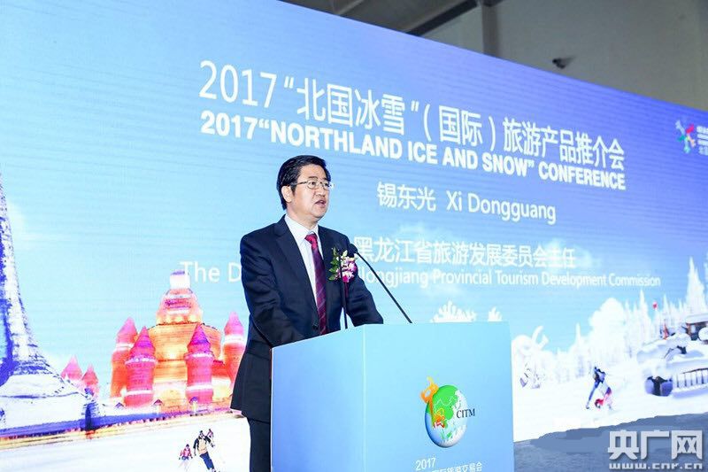 中國冰雪旅游推廣聯(lián)盟理事長、黑龍江省旅游發(fā)展委員會(huì)主任錫東光推介北國冰雪品牌