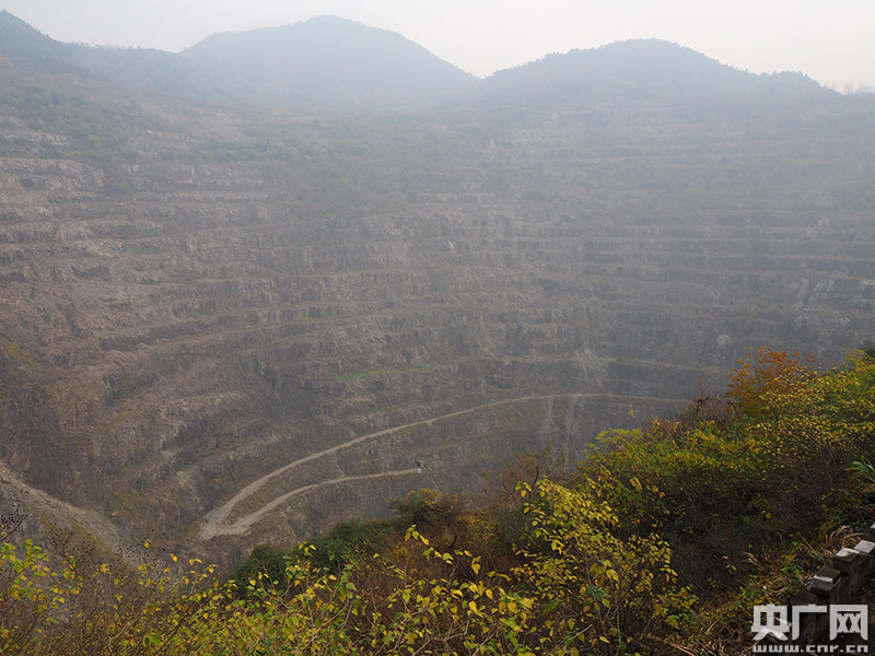 亞洲第一采坑,坑內(nèi)被稱為“掌子面”的采礦點(diǎn),留下了一道道如同巨大階梯的幾何形斷面,使“天坑”如古羅馬的圓形劇場(chǎng)。(央廣網(wǎng)記者何微攝) -