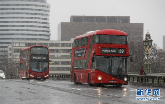 12月10日,在英國倫敦,紅色雙層巴士在雪中行駛。 新華社記者韓巖 攝