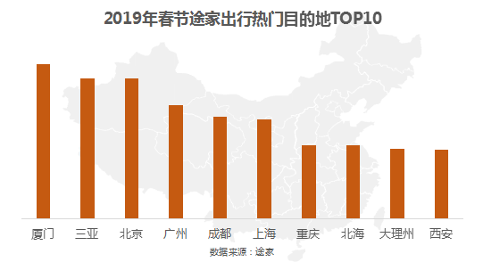 2019年春節(jié)期間,途家平臺TOP10國內(nèi)熱門出行目的地依次為:廈門、三亞、北京、廣州、成都、上海、重慶、北海、大理州、西安。不難發(fā)現(xiàn),除北京和西安外,其余均為南方城市。春季南方氣候溫暖舒適,適合游玩,尤其是廈門和三亞這樣氣候適宜的海邊城市,民宿房源豐富且發(fā)展比較完善,因此成為春節(jié)期間熱門目的地。