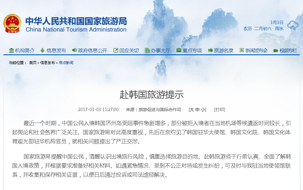央廣網(wǎng)3月3日消息 國家旅游局今日在官網(wǎng)發(fā)布赴韓國旅游提示,提醒中國公民清醒認識出境旅行風險,謹慎選擇旅游目的地。