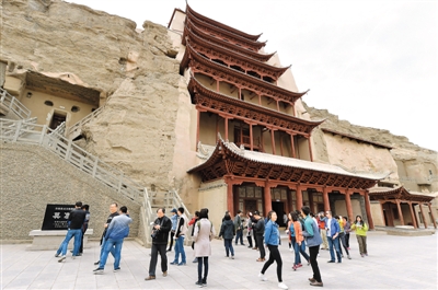 自2016年首屆絲綢之路(敦煌)國(guó)際文化博覽會(huì)在甘肅敦煌成功舉辦以來(lái),敦煌受到越來(lái)越多的關(guān)注。敦煌借此機(jī)遇,推出多項(xiàng)旅游優(yōu)惠政策。據(jù)統(tǒng)計(jì),僅今年第一季度,敦煌市旅游接待量就達(dá)113萬(wàn)人次,總收入達(dá)11億元,分別增長(zhǎng)20%和21.5%。上圖為游客在敦煌莫高窟參觀九層樓。