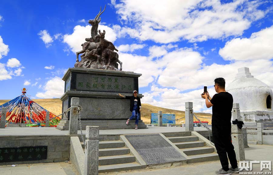 游客在昆侖山口的可可西里自然保護區(qū)藏羚羊雕塑前留影(央廣網(wǎng)記者 張雷 攝)