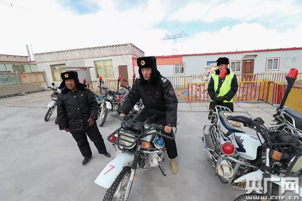 次仁桑珠(中間)發(fā)動摩托車準備和隊員一起巡線(央廣網(wǎng)記者 韓靖 攝)