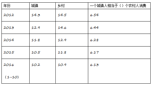 2012年一個城鎮(zhèn)人消費相當(dāng)于6.54個農(nóng)村人消費,5年來這一比例在縮小,到2016年為6.13個農(nóng)村人消費,但是仍然沒有突破6的距離。
