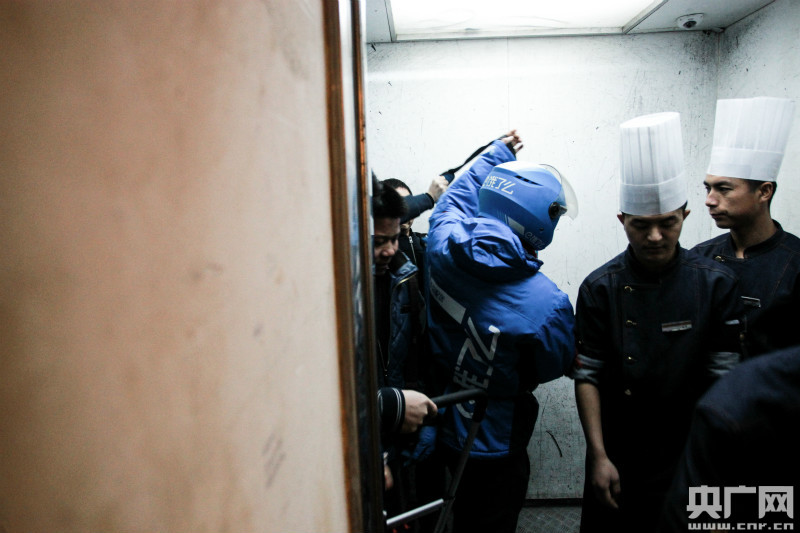 很多高檔寫字樓,需要?jiǎng)潌挝坏拈T卡才能坐客梯上樓。所以,像趙慶富這些送外賣、送快遞小哥一般都只能坐貨梯。每到送餐高峰期間,貨梯的速度很慢,一棟寫字樓又往往有很多層都有訂餐!盀榱斯(jié)省時(shí)間,我很多時(shí)候就直接爬樓梯,最高曾一口氣爬到過20多層”。