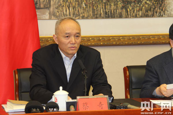 北京市長(zhǎng)蔡奇在中央媒體“京津冀協(xié)同發(fā)展調(diào)研行”專題座談會(huì)上發(fā)言 央廣網(wǎng)記者王晶 攝