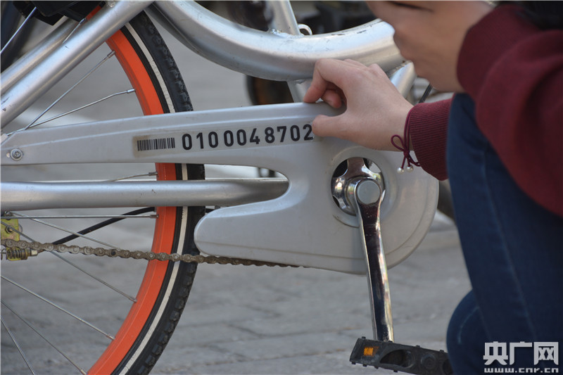 共享單車車牌號(hào)被人涂抹了,海燕在幫它刮干凈。圖片拍攝:央廣網(wǎng)實(shí)習(xí)記者 陳銳海