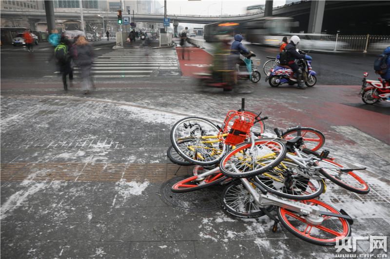 2月22日,在北京國(guó)貿(mào)附近,幾輛損壞的共享單車堆在路口。圖片拍攝:央廣網(wǎng)記者 王永康