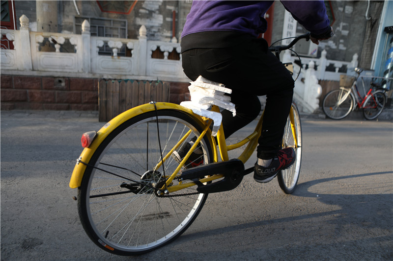 2月23日,北京西二環(huán)附近,一小學(xué)生正在騎一輛損壞的單車,車座是用泡沫板自制的。圖片拍攝:央廣網(wǎng)記者 王永康