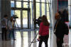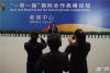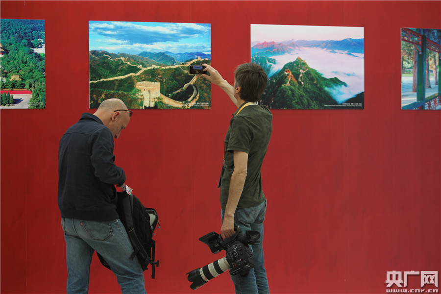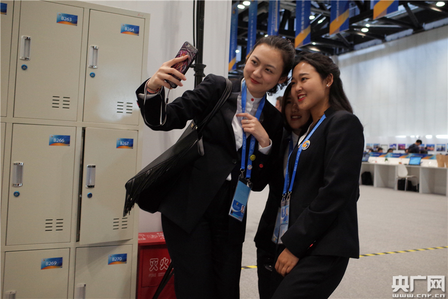 在“一帶一路”國際合作高峰論壇展廳內(nèi),兩名記者在拍照留念。(央廣網(wǎng)記者 王永康 攝) -