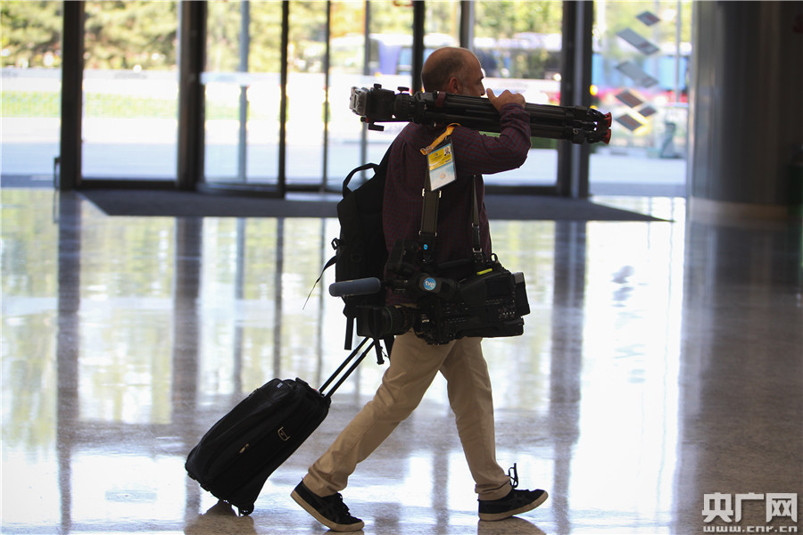 在“一帶一路”國際合作高峰論壇新聞中心內(nèi),一位記者離開會場。(央廣網(wǎng)記者 王永康 攝) -