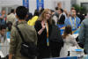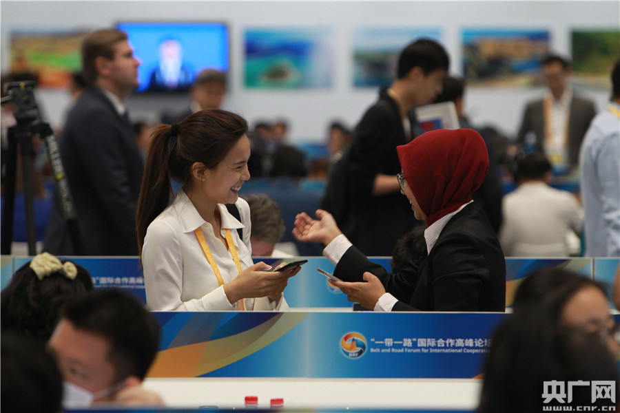 在“一帶一路”國際合作高峰論壇新聞中心內(nèi),兩名記者互留聯(lián)系方式。(央廣網(wǎng)記者 韓靖 攝) -