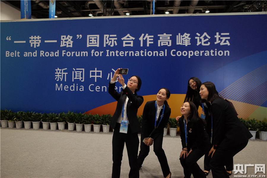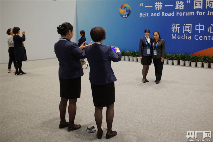 在“一帶一路”國際合作高峰論壇新聞中心內(nèi),工作人員們紛紛合影留念。(央廣網(wǎng)記者 王永康 攝) -